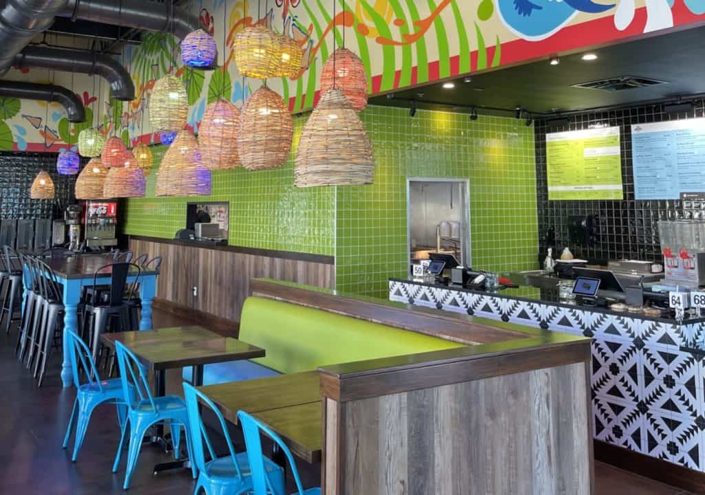 This restaurant operates in a quick-service, counter-order format with made-to-order food preparation and an efficient front-to-back layout. The kitchen sits directly behind the service counter, supporting fast throughput and operational efficiency. The space includes a comfortable indoor dining room and a large outdoor patio with tables, umbrellas, and lounge seating.